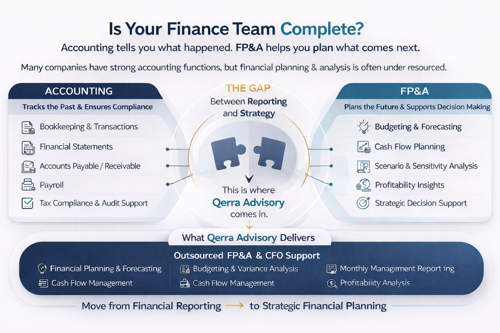 Qerra Advisory was founded by a finance professional with over 10 years of experience in multinational corporations, supporting businesses across a wide range of financial functions. The founder’s background spans statutory accounting, including consolidation of multiple entities, as well as FP&A, management accounting, and project accounting. This breadth of experience provides a strong foundation for helping businesses move beyond compliance-driven accounting toward insight-led financial management.